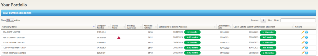 Where Inform Direct identifies a discrepancy with information at Companies House (due to filings being made outside of Inform Direct, and incorrectly) a notification will be raised on the company with the issue. A company with such a notification will show a red ‘Check alert’ for the company on the ‘Portfolio’ screen.