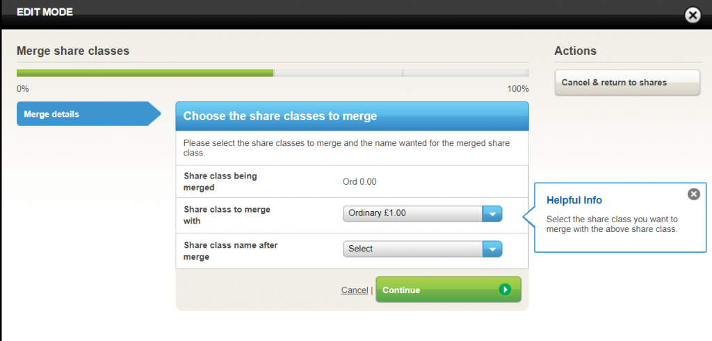It is all done using a simple flow that allows you to choose the share classes to merge and the final share class name you want.
