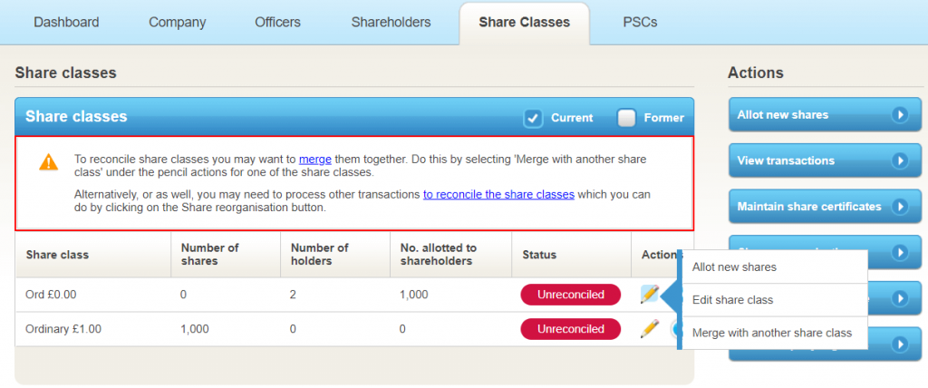 The total number of Ord shares held by the individual shareholders is the same as the number of Ordinary shares in issue and the two shares classes are the same. This means that the two classes should be merged using the new merge with another share class option.