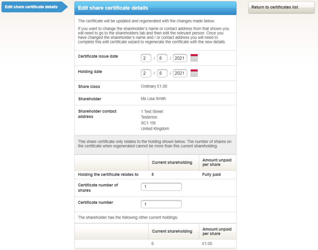 If you want to change the shareholder name or contact address from that shown, you will need to go to the shareholder list and edit the personal details of the shareholder. Once these changes have been made you can then regenerate the certificate with the new details by completing the edit / regenerate certificate process.