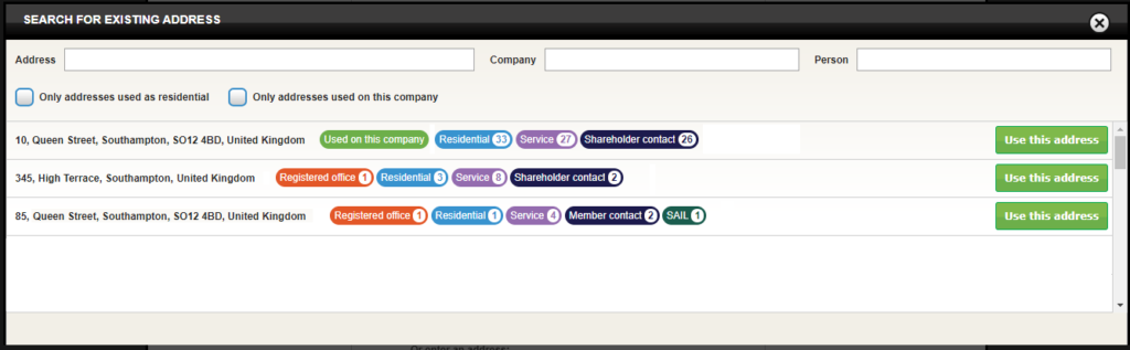 In addition, following on from changes made last month to allow existing address records to be selected when forming a new company and changing a registered office address you can now do this when changing an individual’s residential and shareholder (or member) contact addresses.