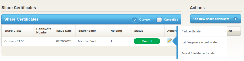 All the actions you can do with existing share certificates are now under the pencil option next to each certificate, giving you the ability to:
