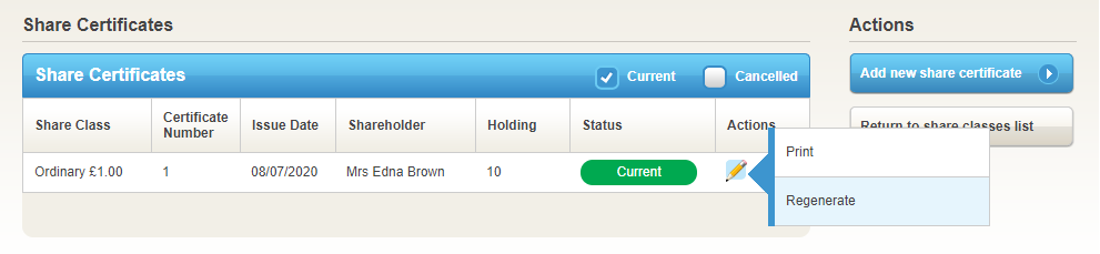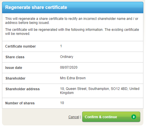 After the name or address has been corrected for the shareholder, by selecting ‘regenerate’ for a share certificate, details that will be generated on the replacement certificate are displayed.