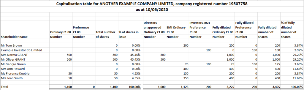 In addition subscribers can generate a cap table showing the fully diluted shareholdings for the company.