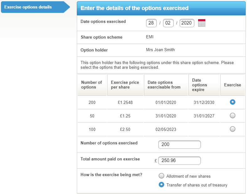 The exercise of the options and associated allotment of shares or transfer out of treasury are all done in one easy process. The system automatically sends the form SH01 to Companies House for allotments or generates the form SH04 where shares are transferred out of treasury.