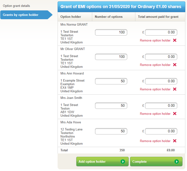 Once you have entered the above details you will then need to enter the personal details of each option holder and the number of options each is being granted.
