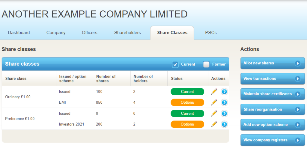 You can also see the overall number of share options for each share option scheme on the share classes screen, as well as being able to see the share options under each share class or share option scheme.