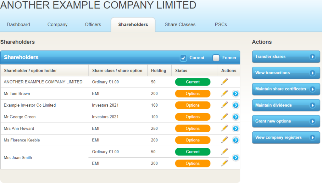 The share options are included in the existing shareholder screen allowing you to see every person’s shareholdings and option holdings on one screen. You can also see a breakdown of each person’s options under a share option scheme.