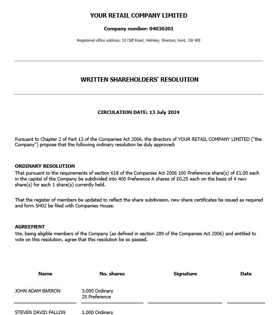 - Written members' resolution to approve new articles of association and change of class name and rights