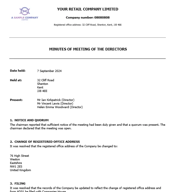 - Board minutes resolving to appoint officer as corporate director and secretary