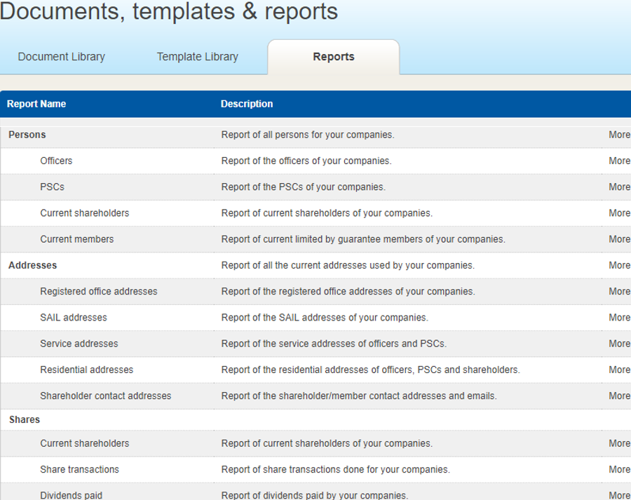 The reports can be tailored only to include selected companies. This means that you can, for example, generate reports for one of your clients showing all the current people of, or all the current addresses used for, or the current shareholders of and their shareholdings in, that client’s company.