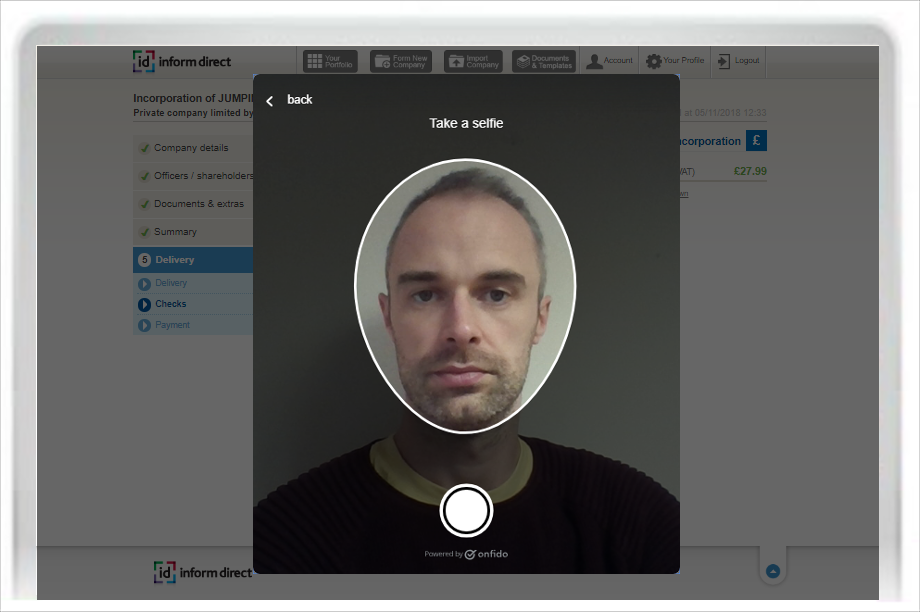 At the appropriate point in the process you’ll be asked to take a photo of an identity document and a selfie. You can do this on a webcam, or be sent a link by text message to do this via a smartphone. The AML check will be run there and then, and you’ll usually have a result in a few minutes!