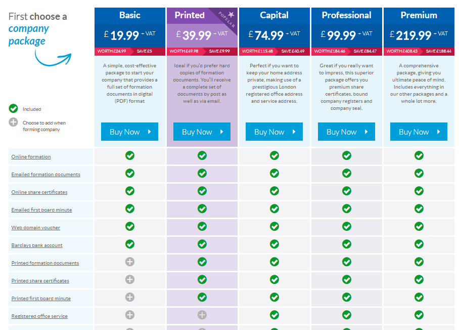 We’ve created the most comprehensive range of company formation packages available, covering all the types of company you can form. From a basic electronic formation with emailed documents to an all-embracing offering with everything you’d need to get started in business, we have a package to suit you.