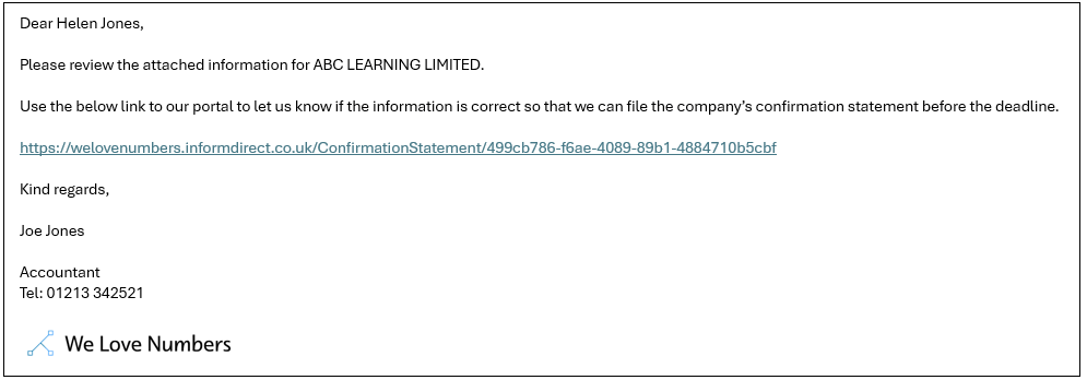 - A company’s confirmation statement information is automatically sent via email to the client company on the scheduled day for agreement
