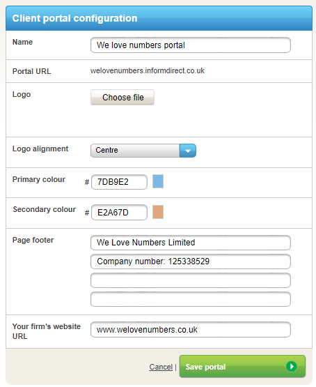 - Add information that you would like to be in the footer of the client portal (e.g. your company name, number etc.)