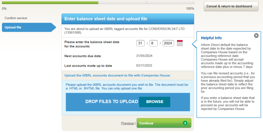 Inform Direct automatically displays the balance sheet date that Companies House are expecting. However, if you are filing revised or amended accounts you may need to adjust this date. The date shown on the screen must match the balance sheet date included in the iXBRL accounts file you are uploading.