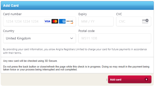 The next time you enter a new card, you will now see a slightly different screen to do this, and when added, payments from then on will be taken on the card entered using our new payment provider, Stripe.