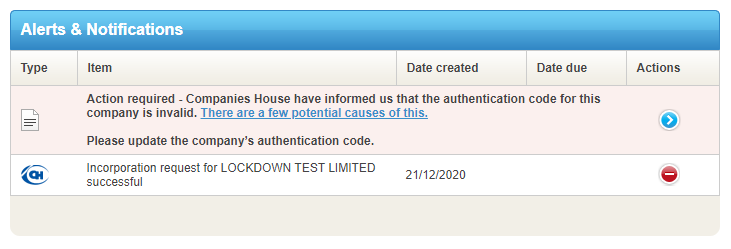 A company may change its authentication code. Where this occurs, and the authentication code stored in Inform Direct no longer matches the new code at Companies House, we’ll raise an alert for the company in Inform Direct to let you know.