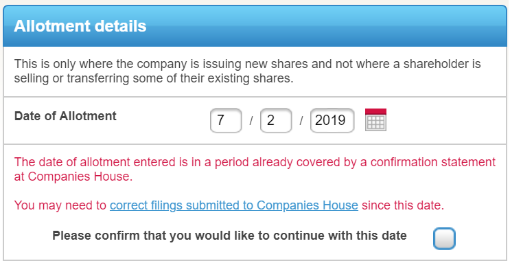 You may occasionally need to make a filing for your company that should have been made prior to the last confirmation statement. Now, when you enter a date prior to the last confirmation statement made up to date you’ll be presented with an option enabling you to continue with the date entered.