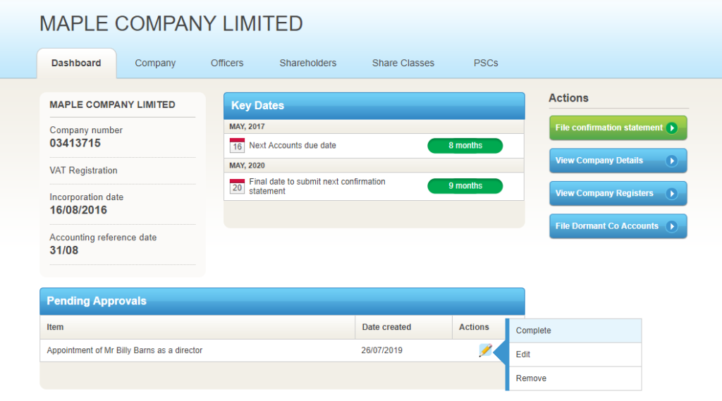 Once you receive approval of the information is received, you can pick it up from where you left off – just 2 clicks and it’s sent to Companies House.