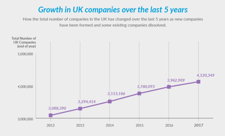 Overall, that means the growth rate in UK companies over 2017 stood at 4%, a significant fall from the 5.4% increase in 2016. We’ve seen 33.4% growth over the last 5 years.