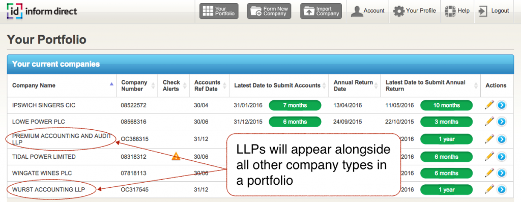 Existing users will find that LLPs can be imported to your portfolio of companies as easily as all the other types supported by Inform Direct. Once added they will be listed alphabetically alongside your other companies.