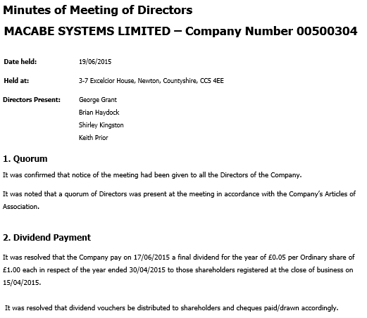 You’ve told us that we could make life even easier by producing a minute of the directors’ meeting to approve the dividend. So that’s just what we’ve done. All the details of the dividend being paid – as well as the names of directors – are populated directly from Inform Direct into a template meeting minute to save you time.