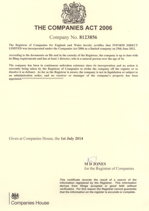- A statement that no action is being taken by Companies House to strike off the company and dissolve it as defunct;